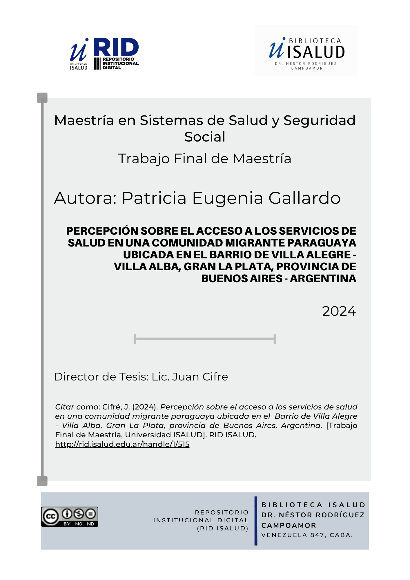 tesis.page.titleprefix Percepción sobre el acceso a los servicios de salud en una comunidad migrante paraguaya ubicada en el barrio de Villa Alegre- Villa Alba, Gran La Plata, provincia de Buenos Aires- Argentina