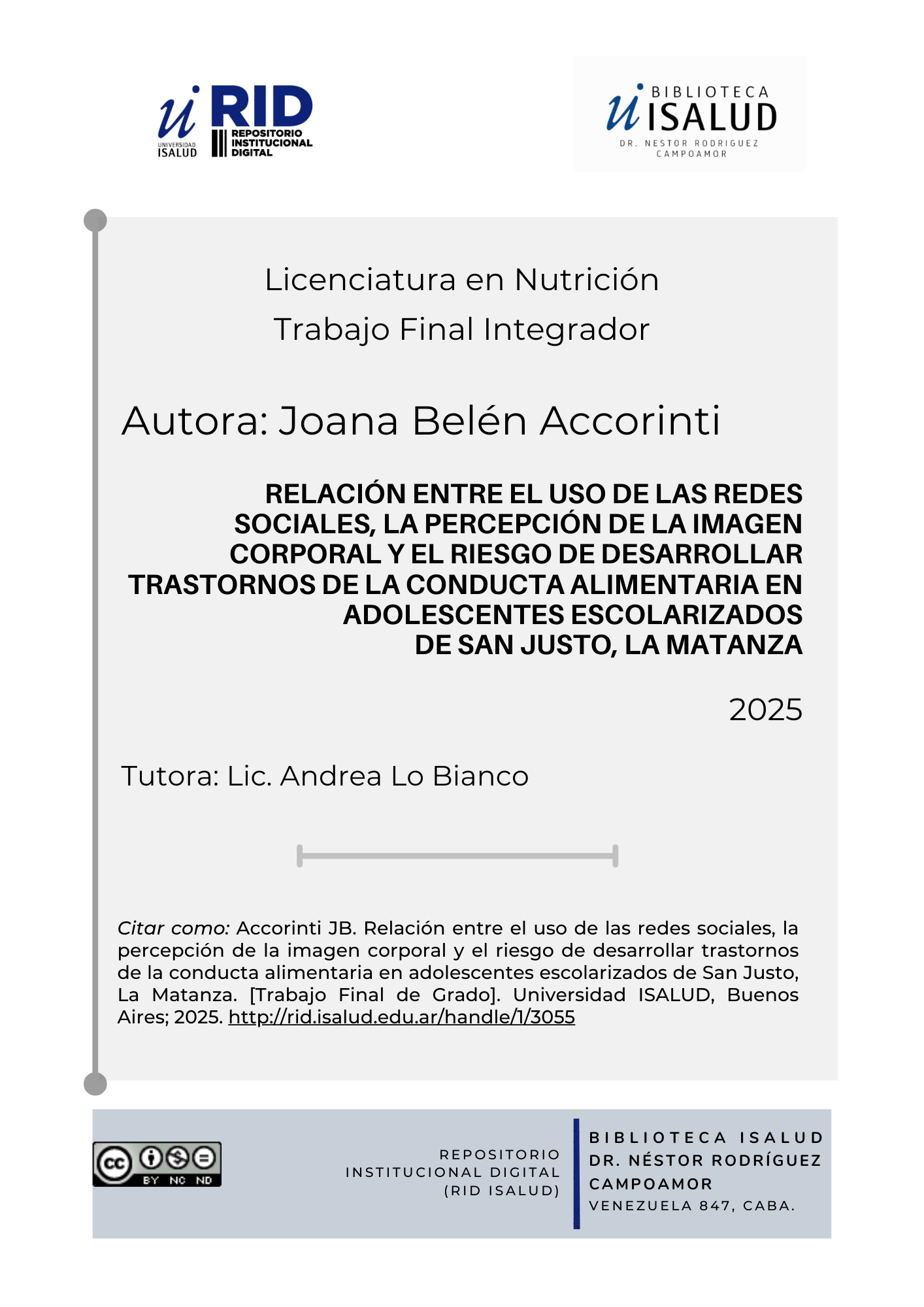 | dc.identifier.citation | Accorinti JB. Relación entre el uso de las redes sociales, la percepción de la imagen corporal y el riesgo de desarrollar trastornos de la conducta alimentaria en adolescentes escolarizados de San Justo, La Matanza. [Trabajo Final de Grado]. Universidad ISALUD, Buenos Aires; 2025. http://rid.isalud.edu.ar/handle/1/3055 | es_AR |