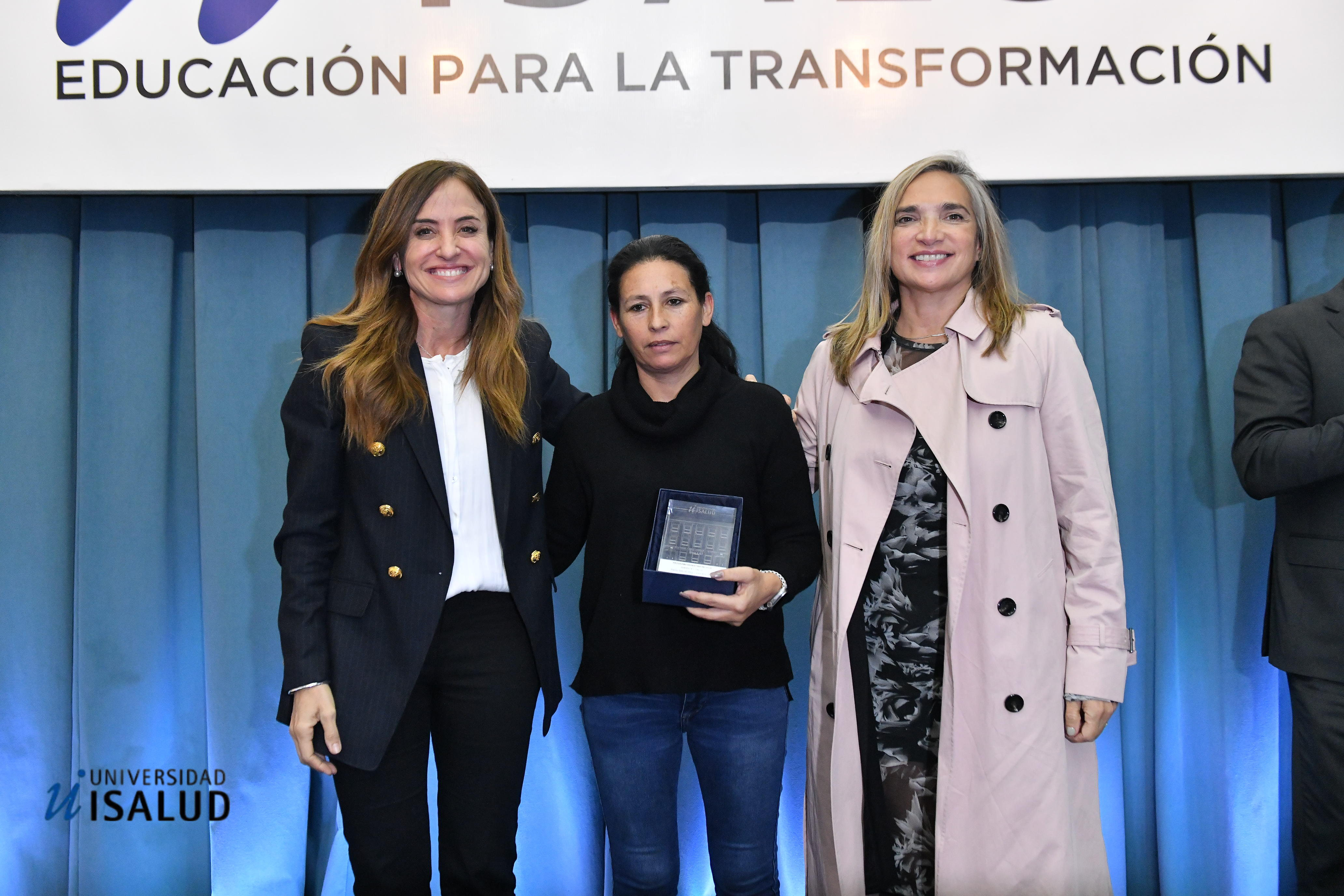Entrega Paula Russo, Mg. en la Licenciatura en Kinesiología y Fisiatría de la Universidad ISALUD y reciben Victoria Tolosa Paz (ministra de Desarrollo Social) y María Castillo (de Economía Social del Ministerio).