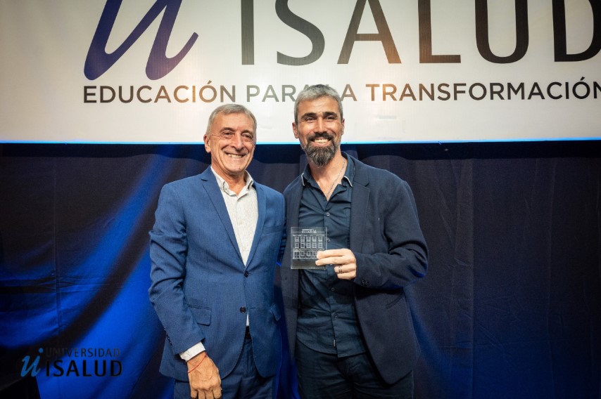 Se hace entrega del Premio ISALUD al Dr. JUAN MANUEL HERBELLA en la categoría: Deporte y Salud (Individual). Es periodista científico en el Diario Perfil donde escribe una columna dedicada a la Ciencia, deporte y salud; doping, lesiones y performance deportiva. Además, es Médico sanitarista y deportólogo. Director de la carrera de especialista en Medicina del deporte y docente autorizado en la Escuela de Salud Pública de la Facultad de Medicina de la Universidad de Buenos Aires. Se recibió de médico en la Universidad de Buenos Aires (a los 23 años y sin dejar el fútbol) con diploma de honor. Durante quince años como futbolista profesional recorrió Latinoamérica, vivió en cuatro países y en siete ciudades diferentes. Jugó en once equipos. Magister en Administración de Sistemas y Servicios de Salud. Actualmente doctorando en Salud Colectiva. El premio lo ENTREGA Oscar Incarbone (izquierda), Coordinador de la Tecnicatura en Salud, Alimentación y Actividad Física y lo RECIBE el Dr. Juan Manuel Herbella (derecha).