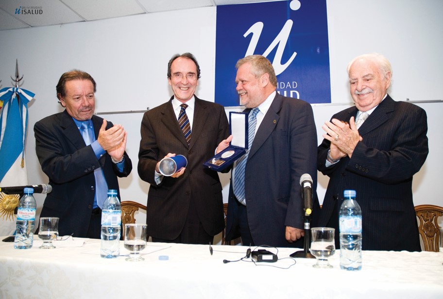 Ricardo Gutiérrez Martí recibe la distinción como profesor Honoris Causa de manos del presidente de la Fundación ISALUD, Mario González Astorquiza (derecha); el rector de la Universidad, Carlos Garabelli (centro); y el vicerrector, Eugenio Zanarini (izquierda).