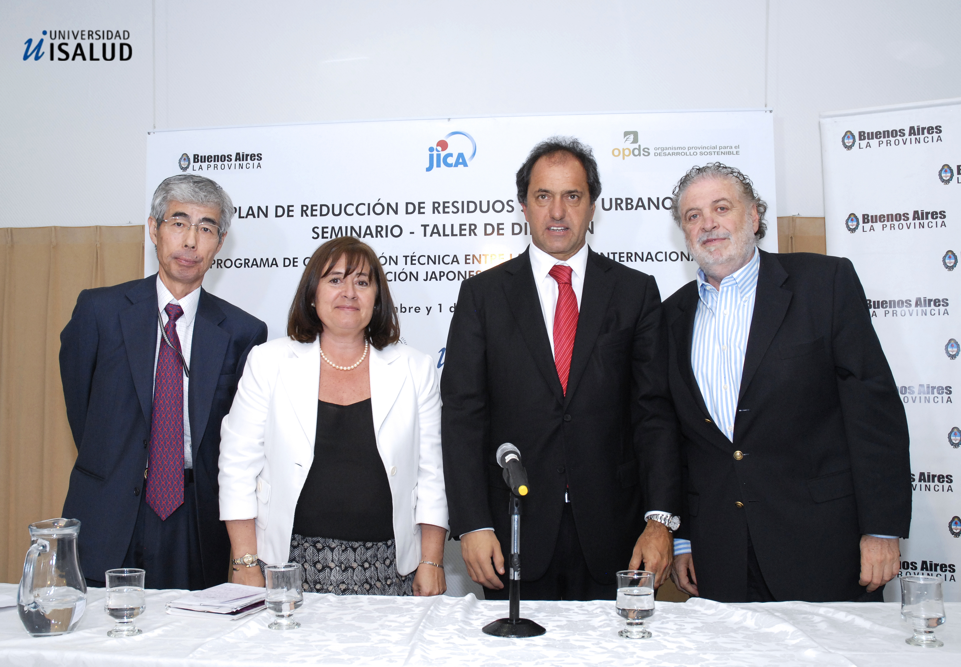 El gobernador bonaerense Daniel Scioli; el embajador argentino en Chile, Ginés González García; el embajador de Japón en nuestro país, Hitohiro Ishida; y la entonces directora ejecutiva del OPDS, Ana Corbi presentaron el Programa para la reducción de los residuos sólidos urbanos en la Universidad ISALUD.