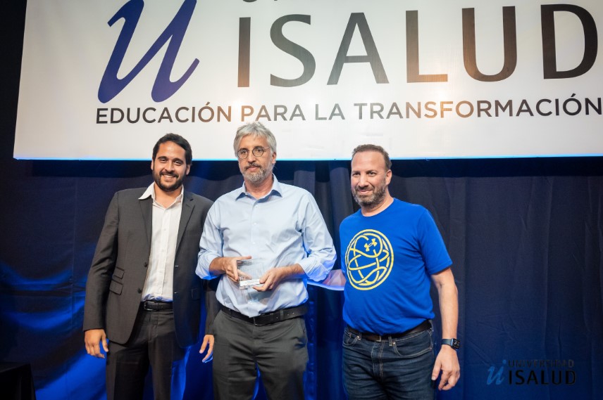 Se hace entrega del Premio ISALUD al Dr. FERNANDO POLACK en la categoría: Innovación y Salud (Individual). Es Médico pediatra infectólogo, graduado con honores en la Universidad de Buenos Aires. Profesor e investigador en las universidades Johns Hopkins y Vanderbilt en EEUU. En 2003, Fernando creó la Fundación INFANT en Argentina, para encontrar soluciones a enfermedades pediátricas vinculadas a la pobreza. Es Personalidad Destacada de las Ciencias de la Ciudad de Buenos Aires. En 2020, lideró a mil profesionales en el estudio que permitió la primera aprobación para uso de emergencia en el mundo de la vacuna de ARN mensajero contra Covid de Pfizer. Fernando tiene dos hijos, Leandro y Julia. En 2024 creó Alamesa, un restaurante autosustentable manejado y atendido exclusivamente por 40 jóvenes neurodiversos; entre ellos, su hija. El emprendimiento ha obtenido excelentes reseñas con puntaje casi ideal, un documental producido por Juan Jose Campanella en la plataforma Max y más de 125.000 seguidores a la fecha en redes sociales. Alamesa ha recibido reconocimientos de la Secretaria de Turismo, la Legislatura de CABA, la Cámara de Diputados, y tuvo una extensa difusión en decenas de medios. El premio lo ENTREGA Fernando Pérez, Director de la carrera de Terapia Ocupacional (izquierda) y lo RECIBE el Dr. Fernando Polack (centro), acompañado por el Director de “Alamesa”, Sebastián Wainstein (derecha).