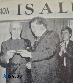Hoy, después que han transcurrido más de 35 años desde su retiro activo del automovilismo, el quíntuple campeón mundial Juan Manuel Fangio mantiene su carisma entre millones de fanáticos de todo el mundo. Todavía recordamos aquellos cortos televisivos que protagonizó con el presidente de nuestra Fundación, para prevenir sobre los accidentes en ruta. Fue un halago que estuviera presente en nuestra fiesta. Instante en que el Dr. Ginés González García entrega el Premio Isalud 1993 en la Categoría: Sociedad y Salud (Individual).