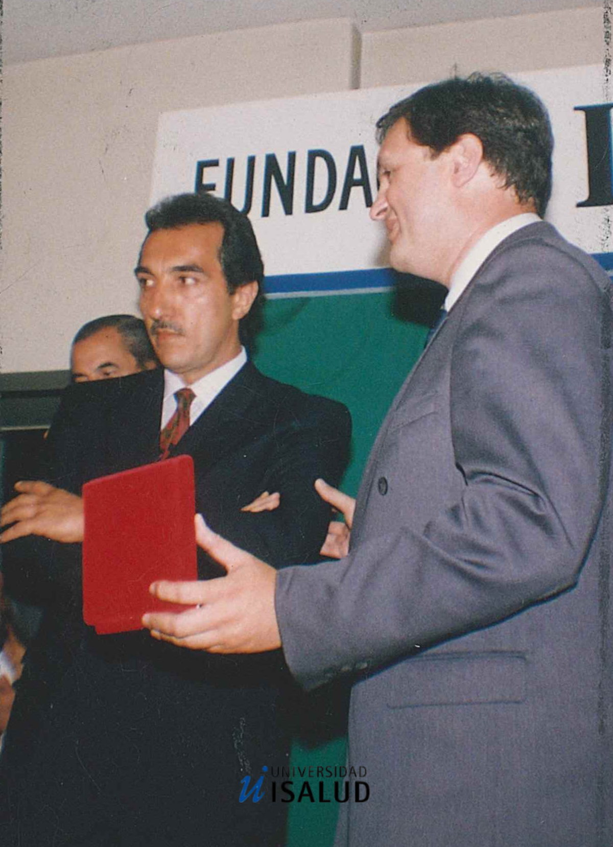 El Premio Isalud 1993 en la Categoría: Medios de Comunicación (TV - Institucional) se entregó al Programa "Edición Plus". También es conmovedoramente solidaria, por eso se le premia. Recibe Néstor Maquiavelli y entrega el Dr. Alberto Díaz Legaspe.
