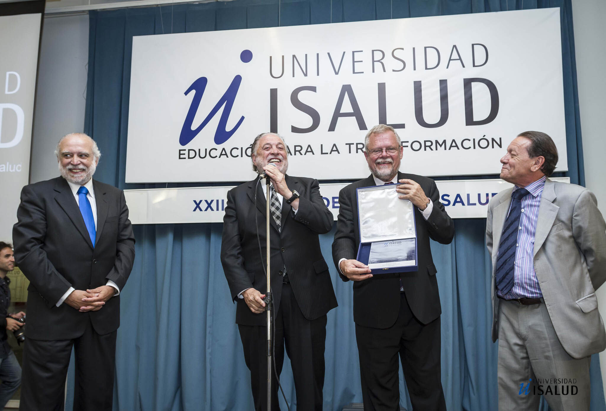 El 12 de diciembre de 2013 la Fundación ISALUD entregó su tradicional reconocimiento a personalidades del ámbito público y privado, y a programas oficiales que se destacan por su aporte a la salud, el medio ambiente, la economía y la sociedad en su conjunto. El ex rector de Universidad ISALUD, Carlos Garavelli, recibe un reconocimiento por su paso por la institución rodeado, a la izquierda, por el rector de la Universidad, Rubén Torres, y el presidente de la Fundación ISALUD, Ginés González García; y a la derecha, por el vicerrector, Eugenio Zanarini.