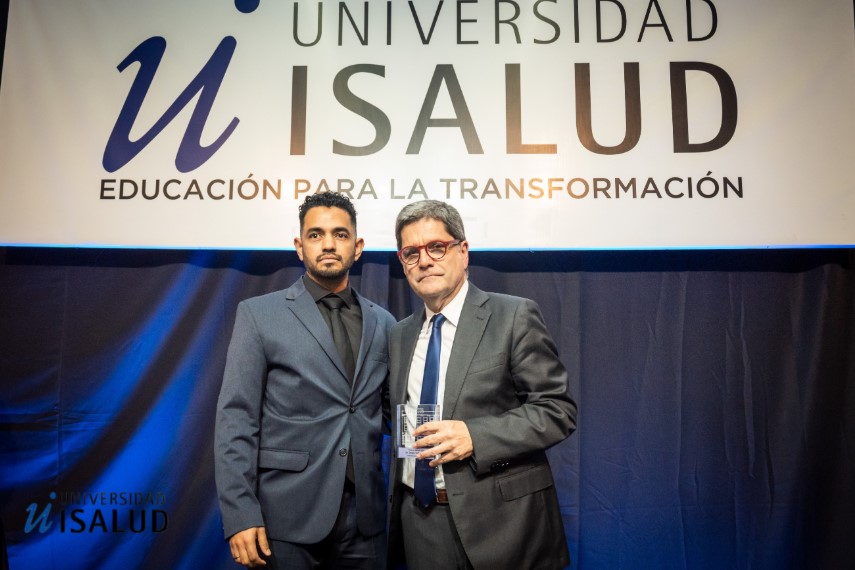 Se hace entrega del Premio ISALUD al Dr. JORGE TARTAGLIONE en la categoría: Comunicación y Salud (Individual). Es Médico cardiólogo. Ex Presidente de la Fundación Cardiológica Argentina. Miembro Titular de la Sociedad Argentina de Cardiología. Desde 1999 se ha dedicado a comunicar temas de salud en diversos programas de televisión, como el Noticiero de Telefé; conductor y realizador de los ciclos “Emergencias 24hs”, “Código de Tiempo”, “80 pulsaciones” y ”Doctorvid”. Panelista del programa de Mario Pergolini Cuál es? y Vorterix. Es Conductor productor del programa diario “MEDICO DE FAMILIA” emitido en CANAL 9 y columnista en el programa “La inmensa minoría” (FM 89.9 Radio con vos). Es autor de los libros: “Todos somos médicos”. “El cerebro que late”, “Héroes Argentinos” y “Pequeños grandes cambios”. El premio lo ENTREGA Joney Briceño, Secretario de Administración y Finanzas (izquierda) y lo RECIBE el Dr. Jorge Tartaglione (derecha).