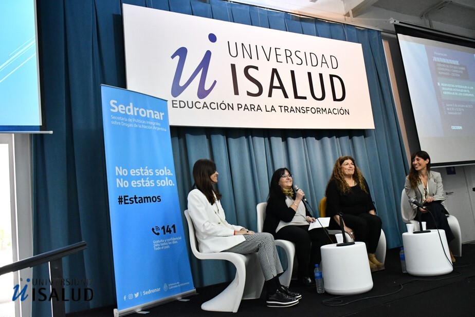 De izq. a der.: Maya González Bender (Secretaria de Extensión Universitaria y Vinculación Tecnológica de la Universidad ISALUD), Silvia Zambonini (Vicerrectora Académica de ISALUD), Gabriela Torres (titular del Sedronar), y Valeria Marolla (Directora del Cecodh).
