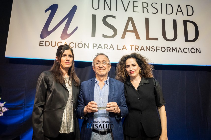 Se entrega el Premio ISALUD a la ASOCIACIÓN CIVIL PALLIUM LATINOAMÉRICA en la categoría: Servicios de Salud (Institucional). La asociación nace como un programa no lucrativo de profesionales y centros de cuidados paliativos con implementación y prestigio en Buenos Aires y otras ciudades. Reúnen experiencia en aspectos clínicos, docentes, de investigación y organización en medicina, cronicidad avanzada y argumentación ética en el final de la vida. Se puso en valor un sector del hospital Bonorino Udaondo donde funciona el primer servicio público de cuidados paliativos en el país. Se imparten cursos a nivel grado y postgrado con convenios en Argentina y el exterior, y se desarrollan investigaciones clínicas y de implementación que han sido publicadas en revistas de prestigio. El foco de sus actividades y propósitos incluye, además del mundo profesional, la perspectiva personal y comunitaria, promoviendo el desarrollo de comunidades cuidadoras y compasivas, siendo parte del movimiento internacional de ciudades compasivas. Su programa solidario de cuidados paliativos domiciliarios beneficia a cientos de pacientes y familiares. El premio lo ENTREGA Lorena y Maya González Bender y lo RECIBE el Dr. Gustavo De Simone (centro).
