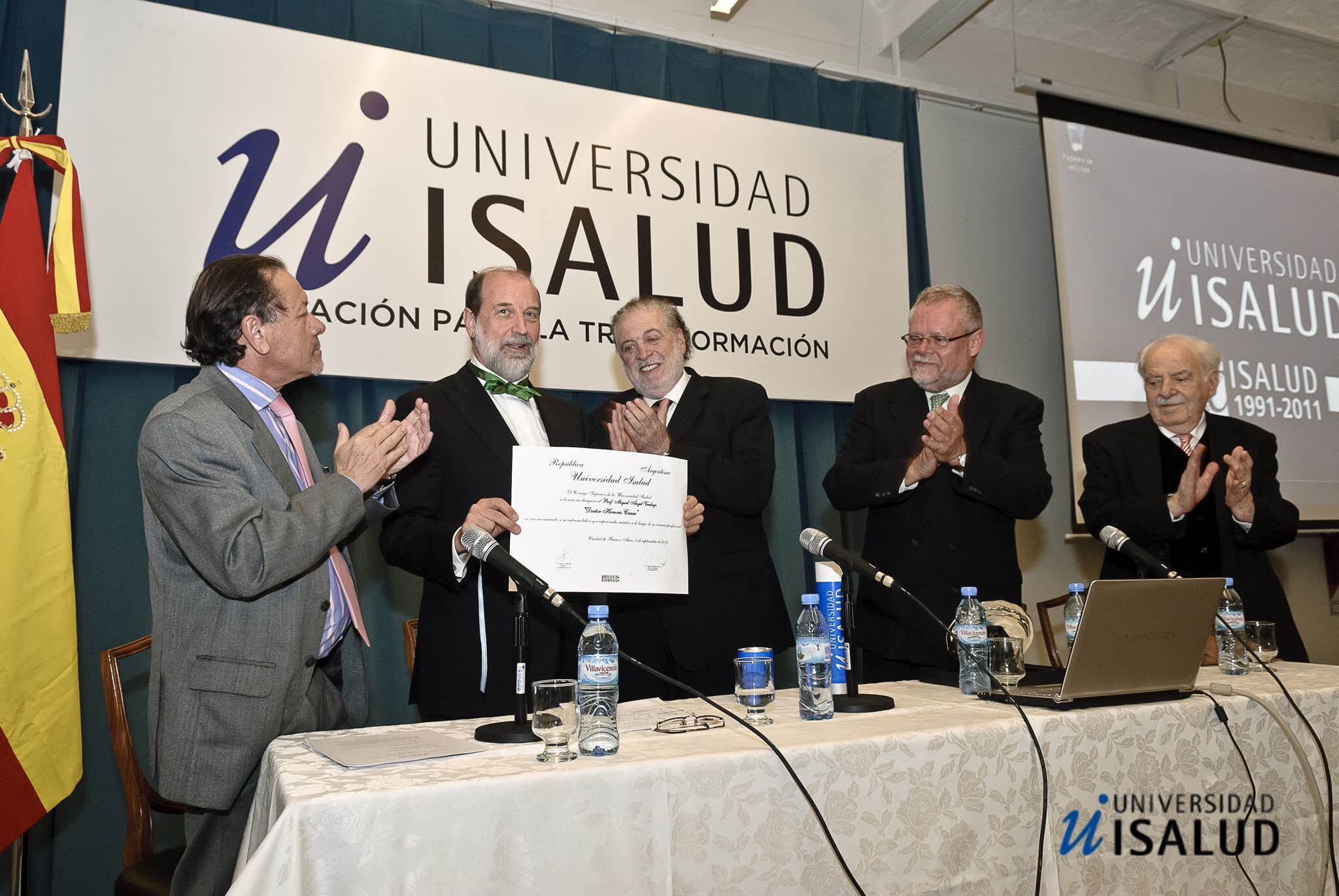 El 3 de septiembre de 2012 la Universidad ISALUD otorgó el título de Doctor Honoris Causa a Miguel Ángel Verdugo Alonso, en reconocimiento a su extensa y destacada trayectoria académica en el área de la discapacidad. De izquierda a derecha: Eugenio Zanarini, vicerrector de la Universidad ISALUD; Miguel Ángel Verdugo Alonso que muestra el título de doctor honoris causa; Ginés González García, embajador argentino en Chile; Carlos Garavelli, rector de la Universidad ISALUD; y Mario González Astorquiza, presidente de la Fundación ISALUD.